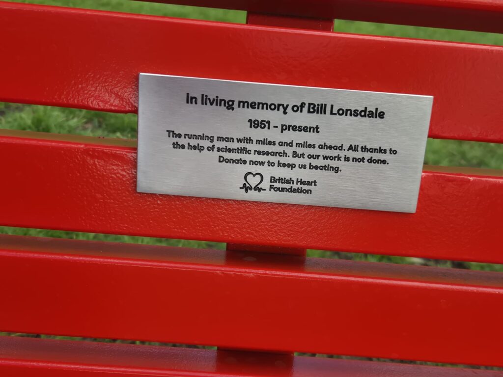 Away from competition, Bill also has a visible connection to the British Heart Foundation through the installation of a red bench at Southall Park, near the start of the local parkrun. The bench forms part of a national campaign recognising people who have survived serious cardiac events and gone on to lead active lives. For Bill, it serves as both a personal marker and a quiet reminder of the importance of maintaining a healthy lifestyle.